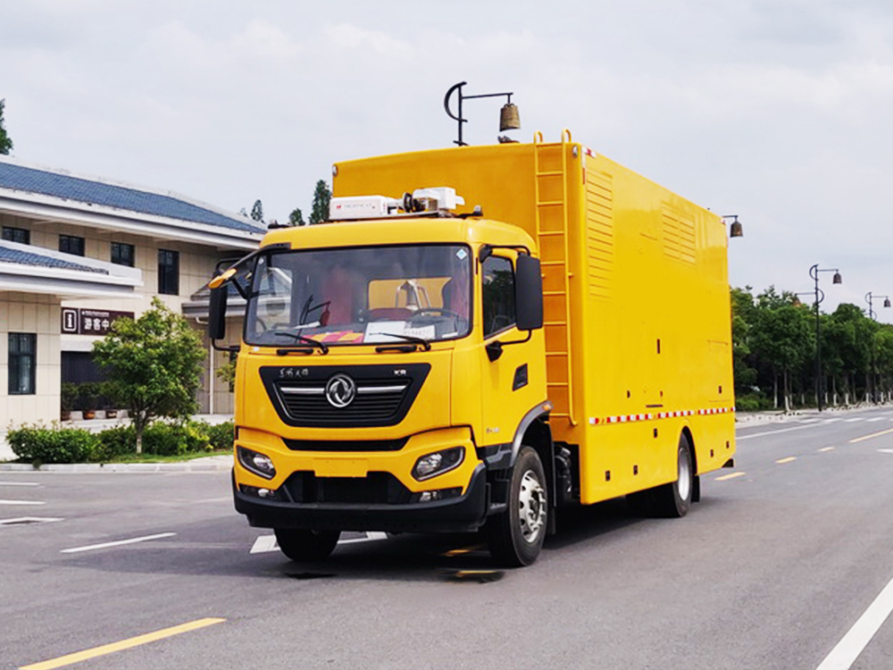 车厢顶部封闭,不可开启。车辆主要专用装置:装有电缆卷盘、救险设备等,内部可选装电驱式排水泵或柴油机驱动式水泵或液压水泵。专用功能及装置:远距离输电装置,电焊机以及应急抢险抢修时必备的光源,气源,电源设备,整车长/轴距/前悬/后悬对应关系为(mm):10000/5800/1430/2770,10000/5800/1400/2800;左右侧面及后下部防护均由裙板结构,后下防护离地高度470mm;随底盘选装限速装置,限速89km/h,随底盘选装驾驶室;ABS型号/生产厂家:3631010-C2000/东科克诺尔商用车制动系统(十堰)有限公司,ABS 8/东科克诺尔商用车制动系统(十堰)有限公司, 4