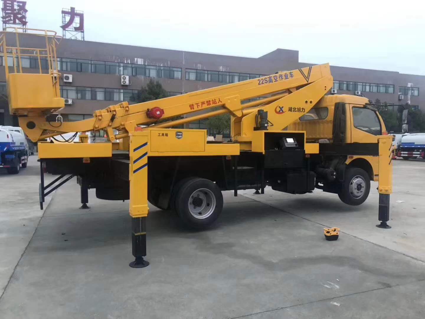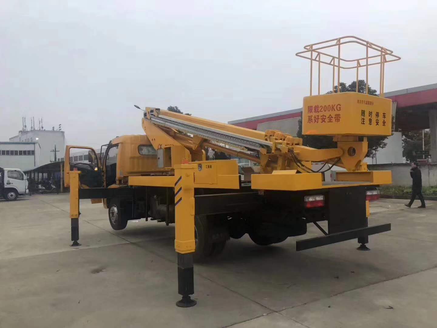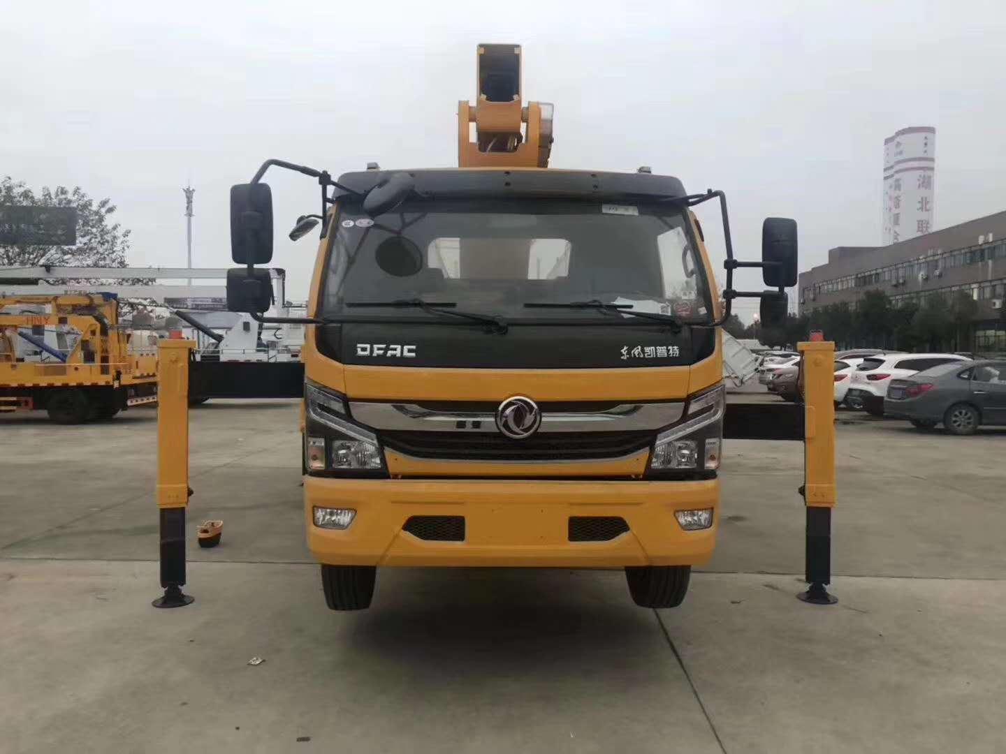 随底盘选装驾驶室;仅采用3800mm轴距;该车后伸350mm;侧防护材料铝合金型材6061-T5,螺栓连接;后防护材料Q235,焊接连接,后防护截面高度尺寸120mm,截面宽度尺寸30mm,下边缘离地高度500mm;ABS型号/厂家:ABS型号:ABS/ASR-24V-4S/4M,厂家:襄阳东风隆诚机械有限责任公司;该车主要用于抢修电力,通讯,路灯等高空作业,专用装置为升降平台和作业臂.