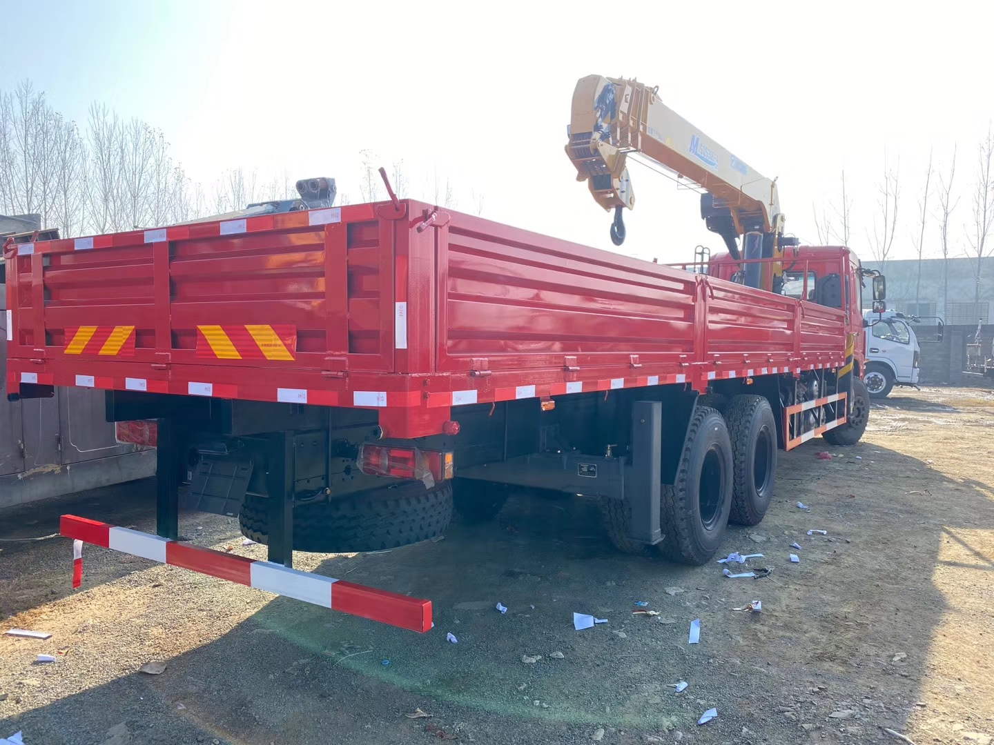 该车的专用装置为货箱和吊机,用于货物的起吊和托运.直臂式吊机型号/最大起升载荷(kg)/吊机重量(kg)/整备质量(kg)分别为:SQ10.0SA4/10000/5100/17100;SQ8.0A4/8000/3600/15600;整车长/轴距/后悬对应关系:12000/5900+1350/3310,12000/5700+1350/3510,10600/4750+1350/3060,9980/4350+1350/2840;侧后防护采用Q235材质焊接连接,后部防护断面尺寸为50×120mm,后部防护离地高度(mm):480.装ABS,ABS型号/生成厂家:3631010-C2000/东科克诺尔